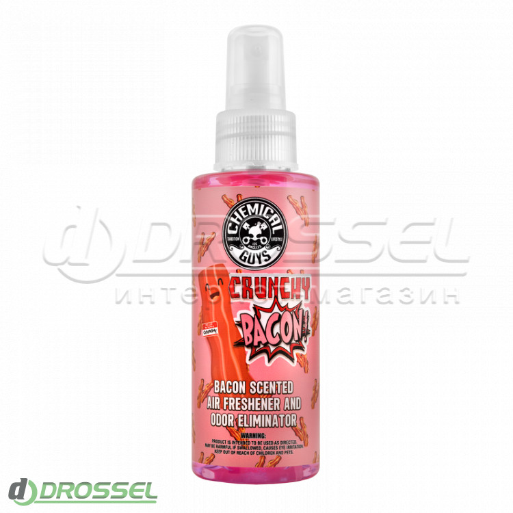Следует отметить, что ароматизатор Chemical Guys Crunchy Bacon Scent Premium Air Freshener and Odor Eliminator наполняет салон транспортного средства запахом обжаренного бекона. Флакон со средством имеет несколько вариантов: AIR24204 (118 мл) / AIR24216 (473 мл).
