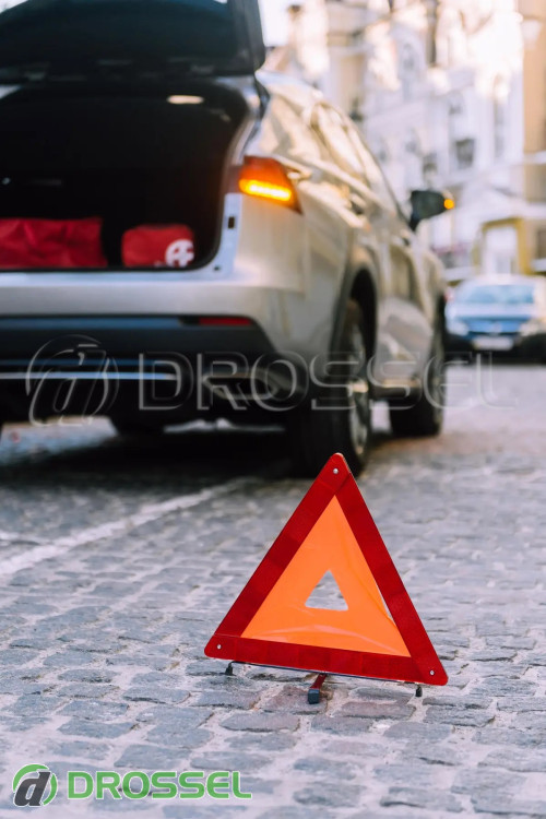 - Треугольный знак аварийной остановки, который обязательно следует установить на дороге при приближении других транспортных средств в случае необходимости;