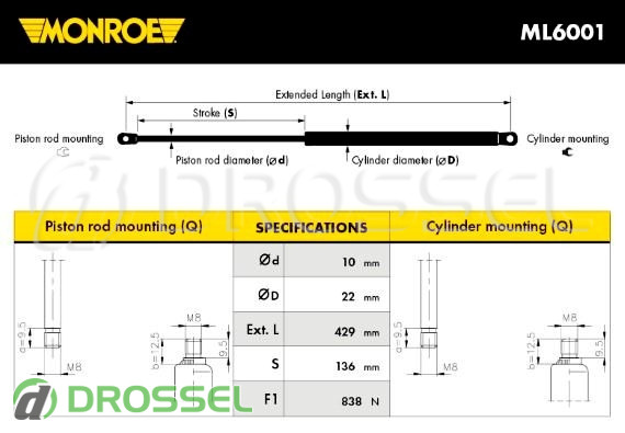Ключевые характеристики газового упора багажника Монро ML6001: