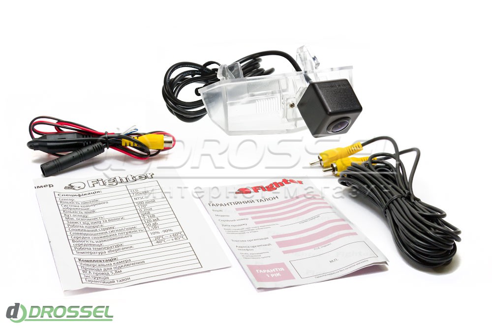 - Комплектація: камера для паркування, набір проводів (живлення, відеокабель 6м), кріплення, гвинти, інструкція по установці, талон з гарантією.