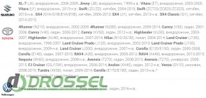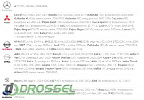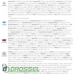| Марка автомобіля | Acura, Citroen, Chery, Chevrolet, Ford, Geely, Great Wall, Honda, Hyundai, Kia, Lexus, Mazda, Mercedes, Mitsubishi, Nissan, Opel, Peugeot, Subaru, Suzuki, Toyota, VW |