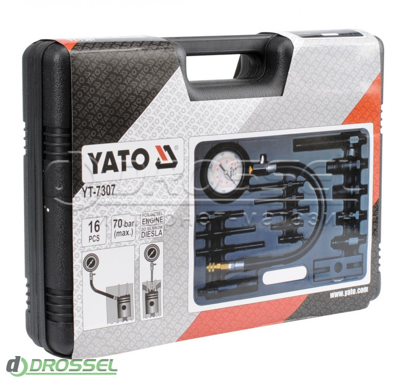 Компресометр Yato YT-7307 відрізняється присутністю великого, ударостійкого та легко читабельного датчика з подвійним калібруванням (0-1000 PSI і 0-70 бар). Комплект поставляється в міцному пластиковому кейсі, що дозволяє транспортувати і зберігати інструменти. Тип роботи - аналоговий.