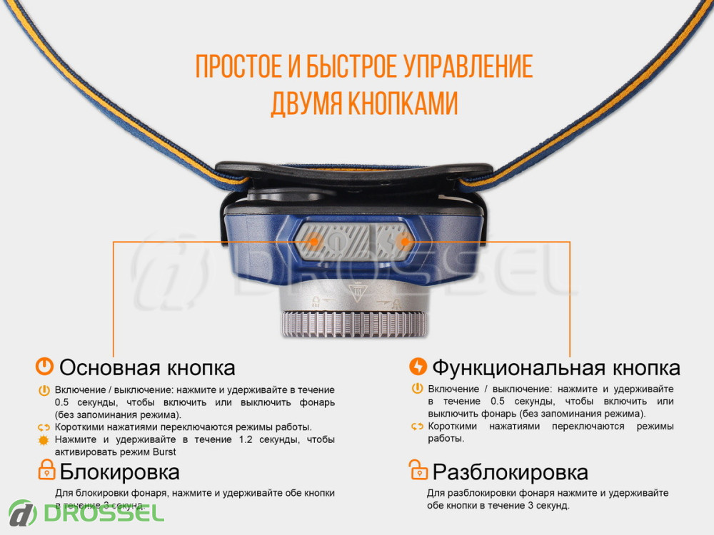 - модель налобного ліхтаря працює від вбудованого літій-полімерного акумулятора ємністю 2000 мАгод;