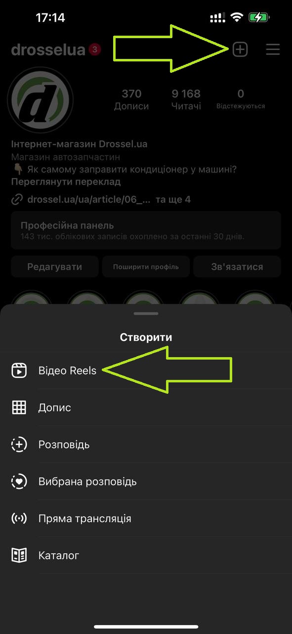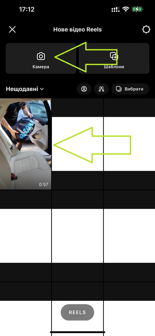1. У верхній частині вашого профілю натисніть значок "+", потім у нижньому меню виберіть "Відео Reels":