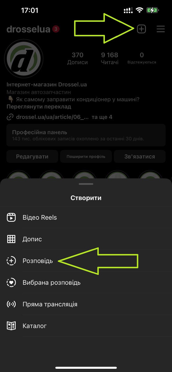 2. У верхній частині профілю натисніть значок "+", потім у нижньому меню виберіть "Розповідь" (на картинках нижче всі кроки будуть позначені зеленою стрілкою):