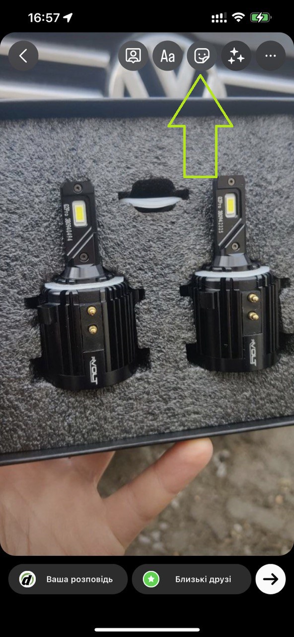 4. Вибране вами фото/відео з'явиться на екрані. Тепер можна додати позначку нашого інтернет-магазину, щоб ми побачили вашу сторіс і могли поділитися нею у себе в профілі (а потім нарахувати вам бонуси). Щоб додати відмітку, натисніть на значок: