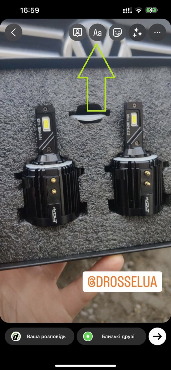 7. Додану позначку @drosselua можна перемістити в будь-яку частину екрана (для цього затисніть її пальцем і переміщуйте по екрану). Також для прикладу ми покажемо вам, як додати текст. Натисніть на значок "Аа":